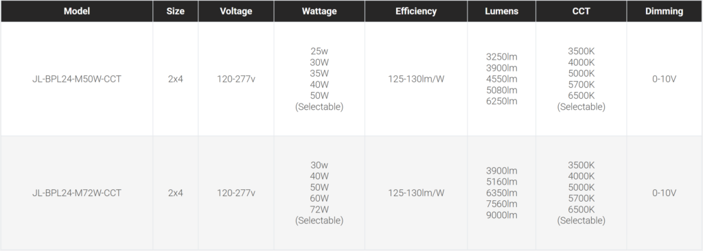 • 5CCT Selectable: 3500K / 4000K / 5000K / 5700K / 6500K