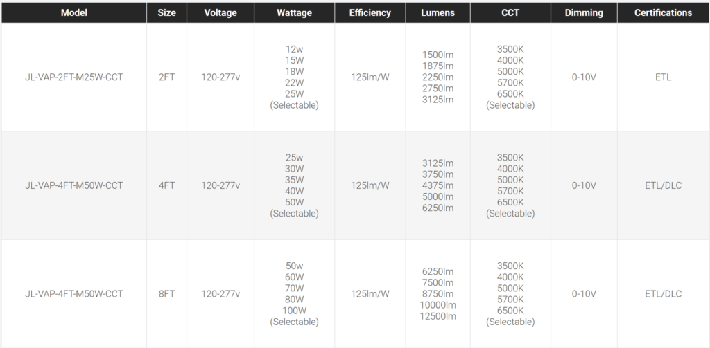 - Lumens: 2FT: 1500–3125lm, 4FT: 3125–6250lm, 8FT: 6250–12500lm