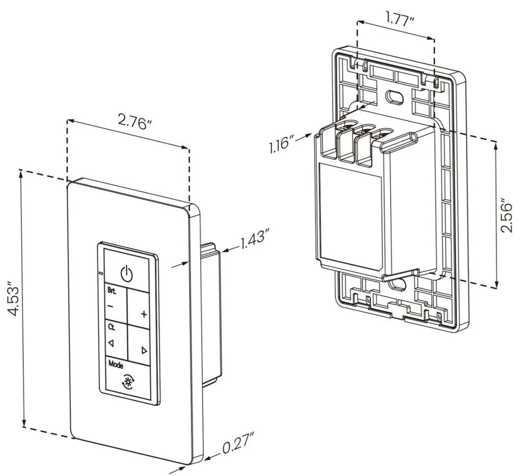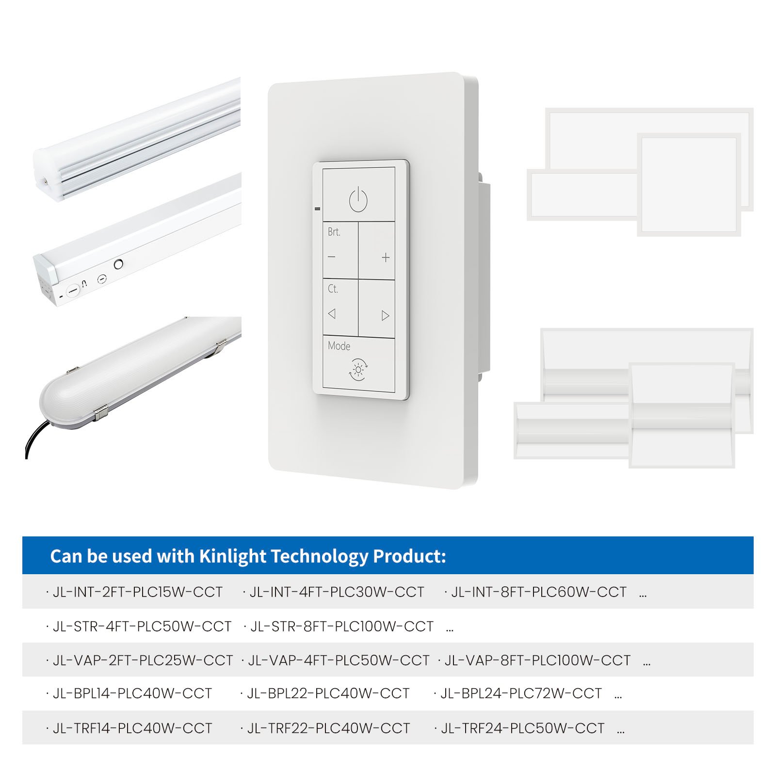 TPLC Smart Switch, Brightness 0%-100%, Color Temperature 2700K-6500K. Can be used with Kin light Integrated Tube light/Vapor Tight Light/Back-Lit Panel Light/Troffer Light. This product can control the lamp turn on/off, brightness, color temperature and custom lighting mode. We hope you enjoy the convenience of this!