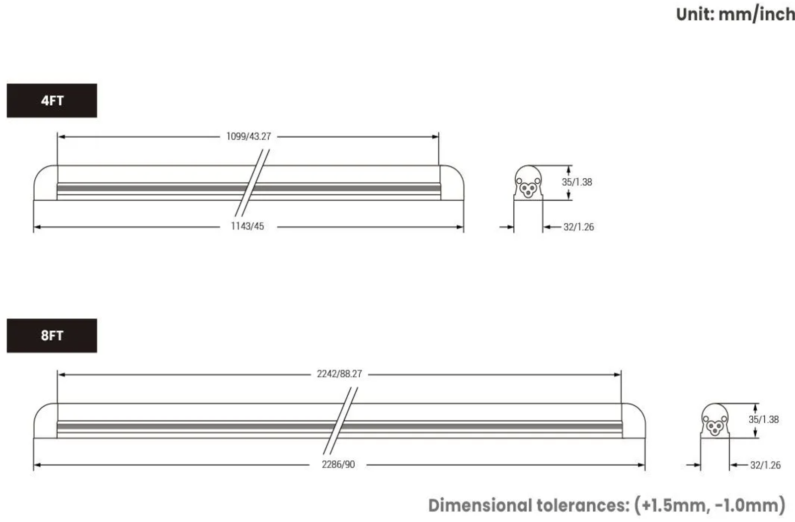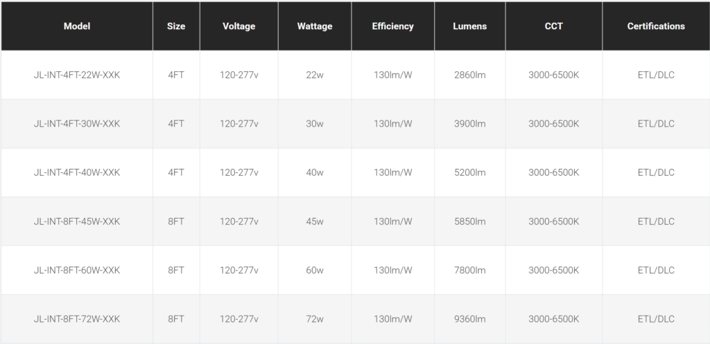 • Wattage: 4FT: 22W / 30W / 40W, 8FT: 45W / 60W / 72W